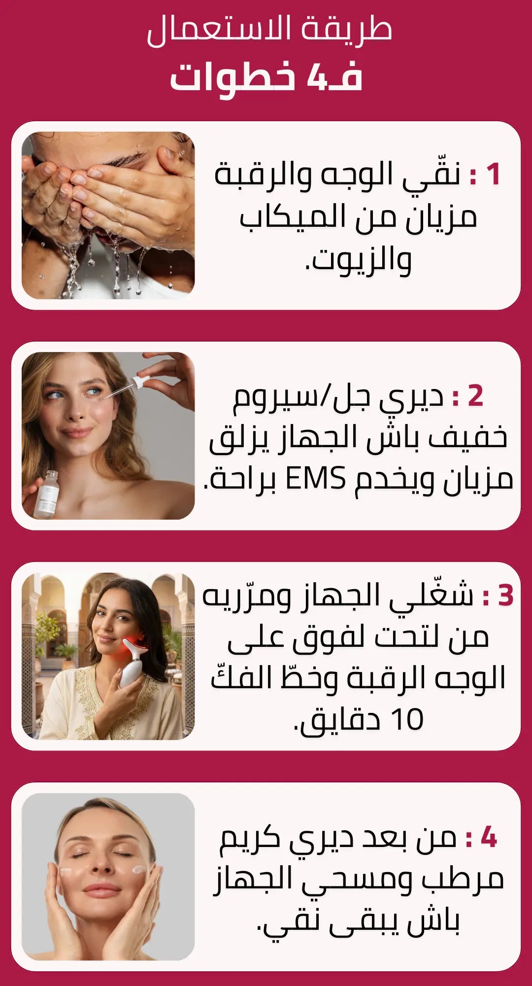 باش تعطي البشرة وقت ترتاح وما تتهيجش، خليه 3–4 مرات فالسيمانة لمدة 5–10 دقايق؛ إلا كنتي جديدة بداي أقل وزيدي بالتدريج.