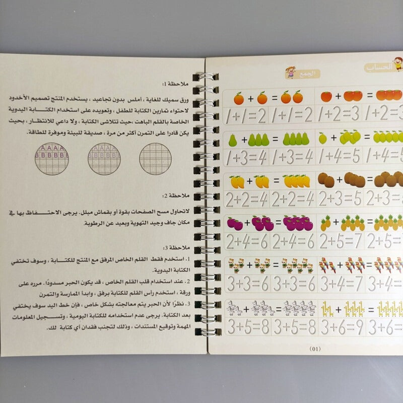 4 دفاتر تعليمية.القلم السحري.عبوات حبر إضافية (مجاناً).ماسكة لتعديل مسكة القلم.